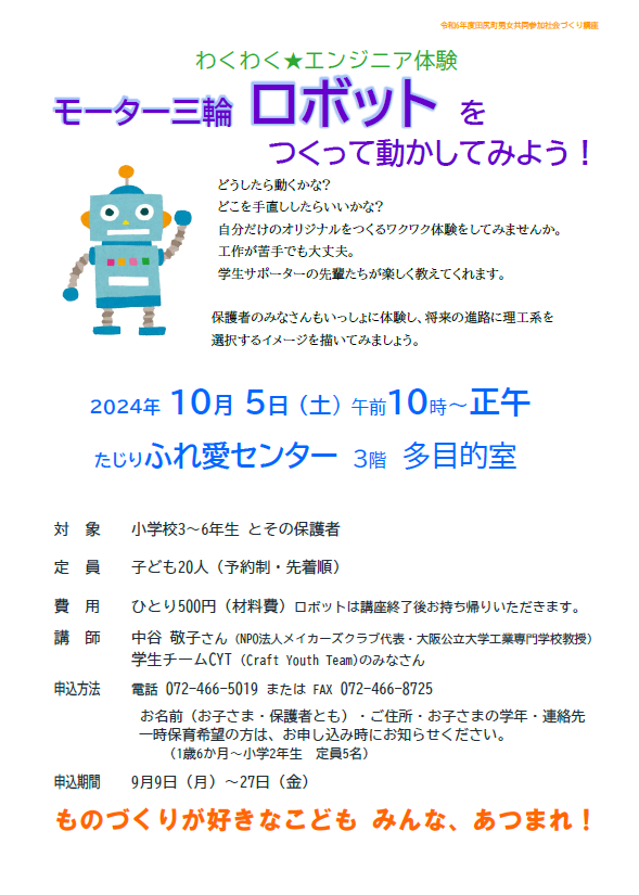 田尻町が主催する工作教室と保護者向け懇話会を担当しました。今回の教室では、親子が一緒にロボット台車の工作に挑戦し、試行錯誤を通じて学ぶ楽しさを体験しました。以下、当日の様子をご紹介します。