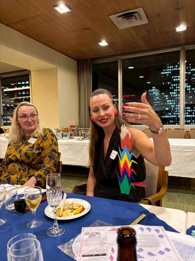 折鶴づくりでは、日本の参加者とエストニアの方がペアになり、身振り手振りで折り方を伝え合いました。言葉が通じなくても、作る動作を通して自然に笑顔が生まれ、会場のあちこちに温かな雰囲気が広がりました。