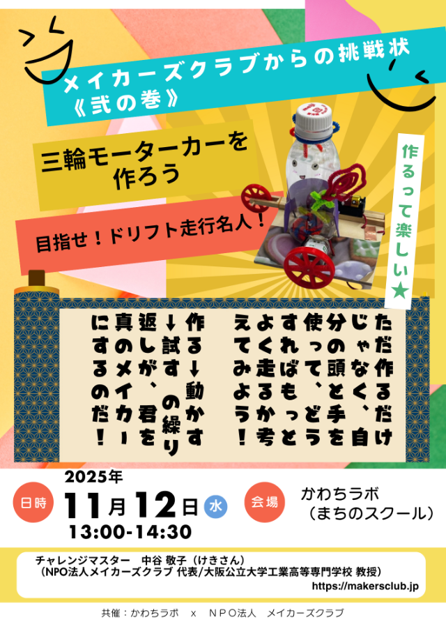 2025年11月12日(水)、河内長野市の「かわちラボ(まちのスクール)」で、NPO法人ぬくもりとNPO法人メイカーズクラブによる工作体験イベント「メイカーズクラブからの挑戦状《弐の巻》」を行いました。