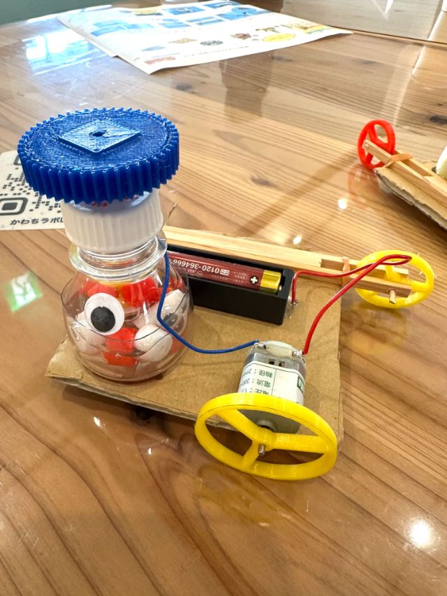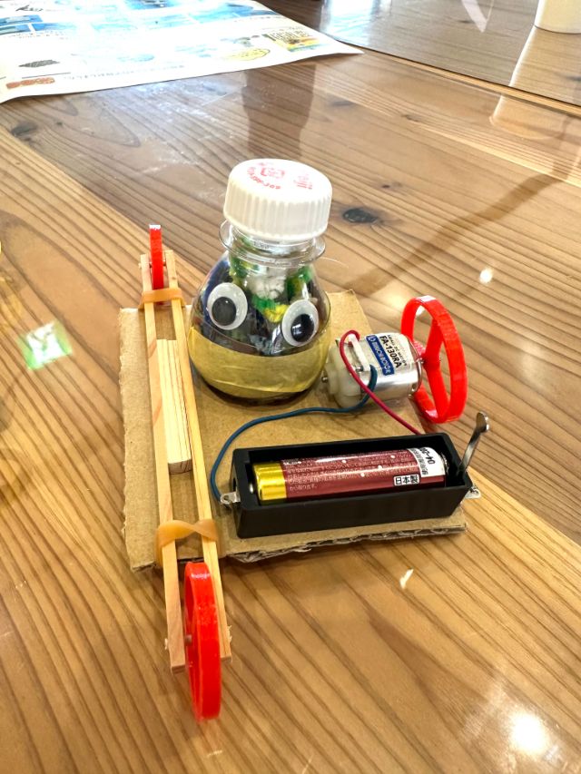 そんな声があちこちから聞こえてきました。うまく走らなかった子も、モーターの位置や重りのつけ方を工夫して、何度もチャレンジしていました。