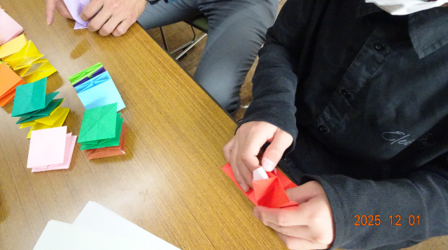 まずは同じ形のユニットを一つずつ折り、折り筋や角をそろえる作業から始めます。指先を見つめながら静かに折り進める姿が印象的でした。既に作ったことがある人もいて、友達に教えてあげたり、ふたつめに挑戦したりと途切れることなく、集中していました。