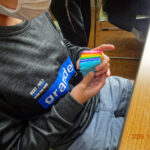 折りためたユニットは、向きや差し込み方を確かめながら少しずつ組み上げていきます。平面だった紙が立体的につながり、円形の形になり、回転させることができます。完成した万華鏡を手にした子どもたちは、色の並びや見え方の違いを確かめながら、自分の工夫が形になる面白さを実感していました。