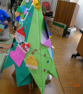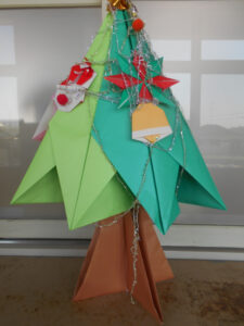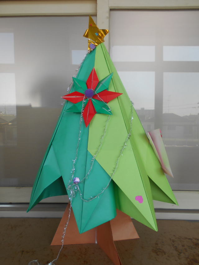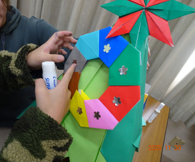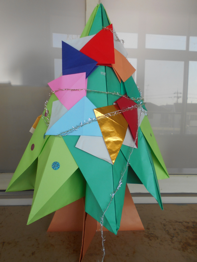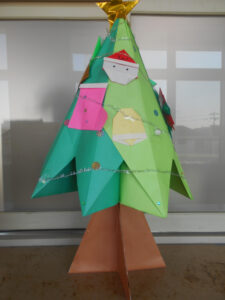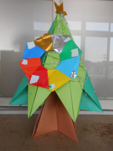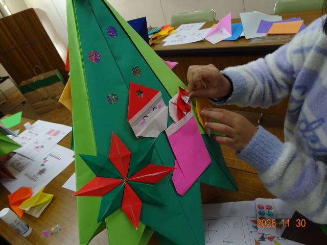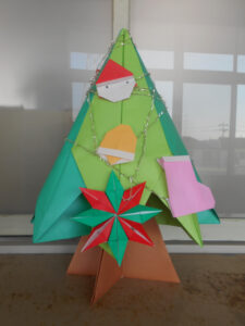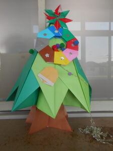 「小さなサンタをくつしたのなかにいれたよ♪」と工夫を教えてくれる人や、ユニットおりがみのリースに型抜きで穴をあけて、色々な色が穴から覗くように工夫する人、プレゼントの飾りを自分で作った人。みんなで一緒に作ったユニットおりがみの飾りから始まって、それぞれが自分の好みのおりがみ飾りを創って、世界に一つだけのオリジナルクリスマスツリーが出来上がっていきます。