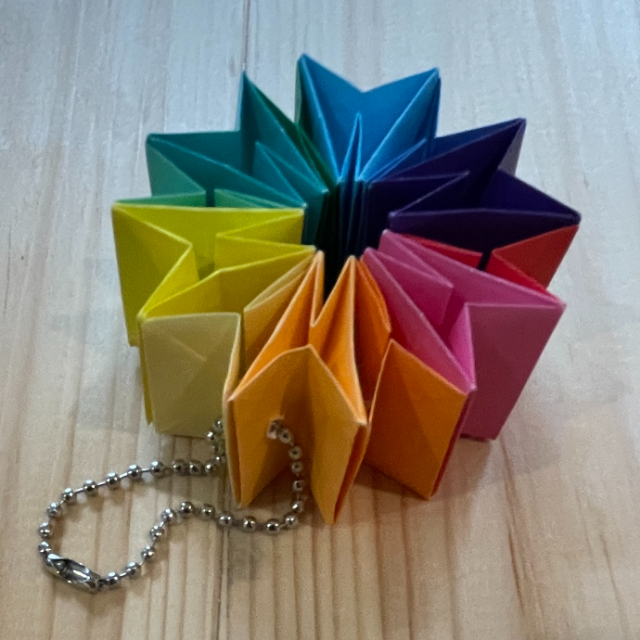 ユニット折り紙の折り工程を確認しながら制作したり、色を選びながら万華鏡のパーツを折っていったりと、すごい集中力で取り組みました。完成した作品とともに記念撮影する子ども達は、表情とともに、色と形に“自分らしさ”が光り輝く時間となりました。